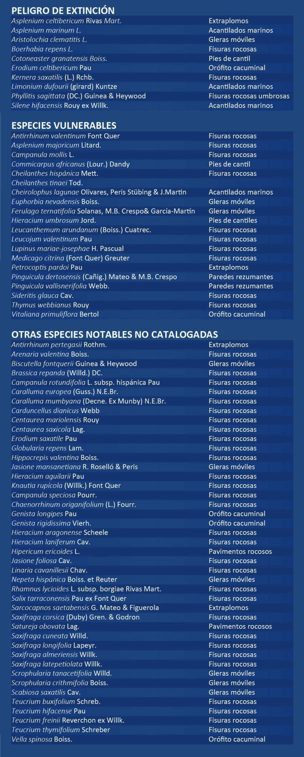 Lista de especies de flora amenazadas en ambientes rupícolas.